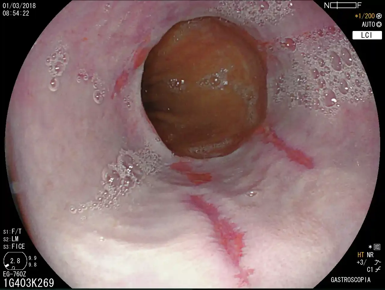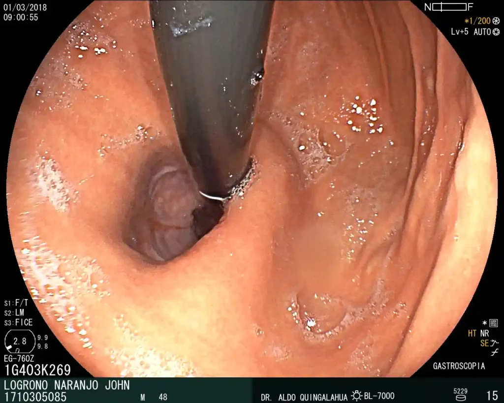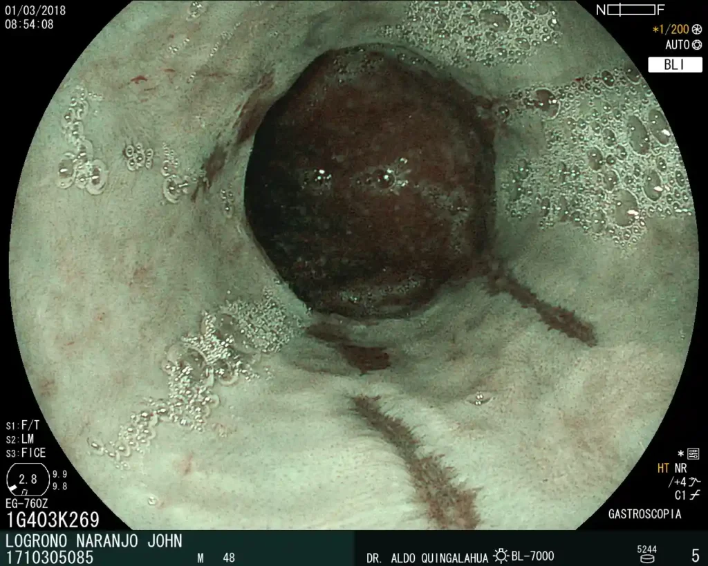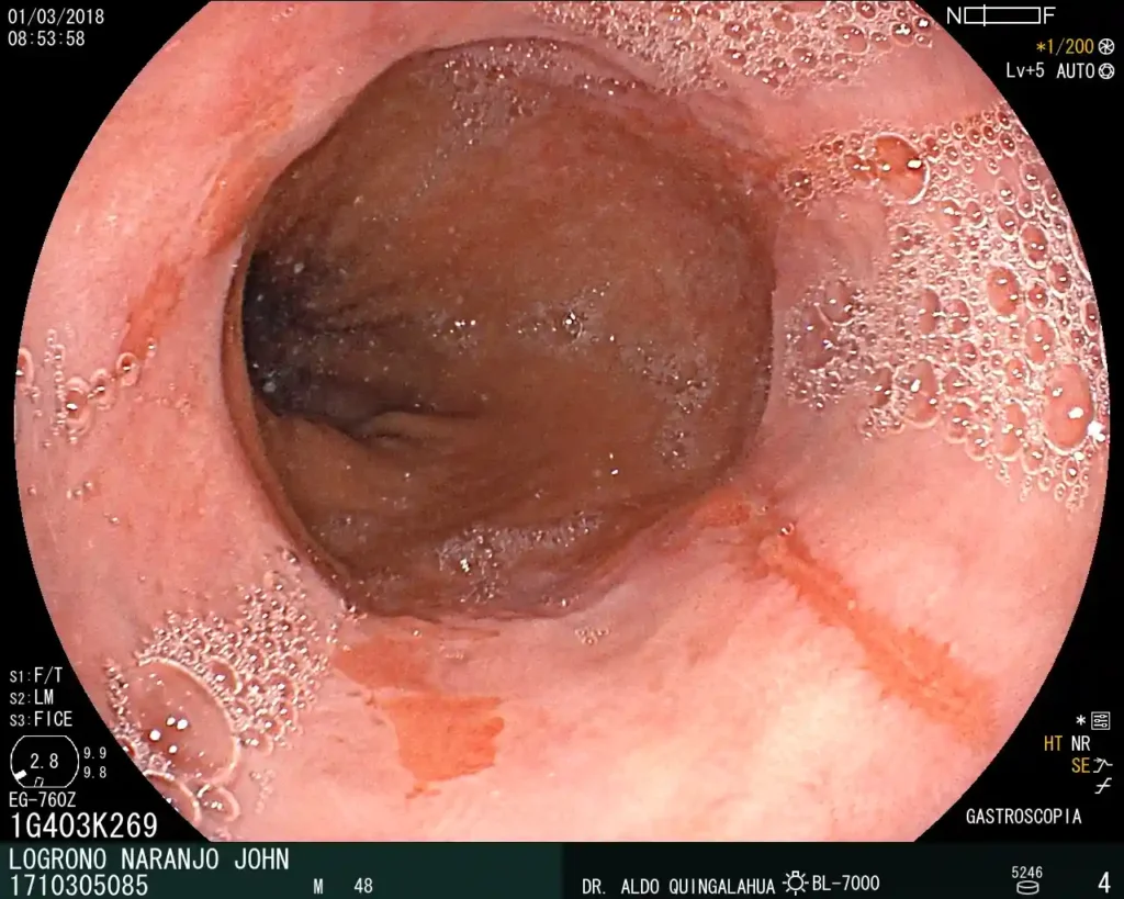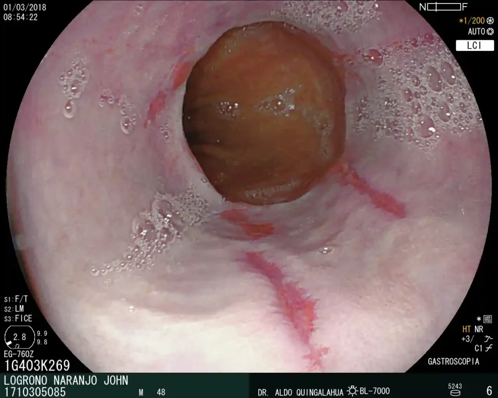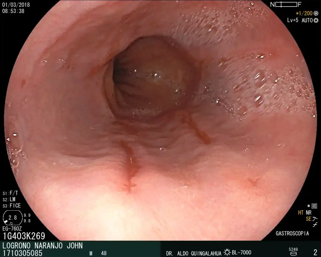 Paciente de 48 años con cuadro clínico de varios años de evolución caracterizado por regurgitación y pirosis intensa; se realiza video endoscopia digestiva alta y se observan varias erosiones lineales mayores de 5 mm no confluentes entre sí, que se evidencian mejor con cromo endoscopia digital con BLI y LCI caracterizándose como una Esofagitis por reflujo grado B de la clasificación de los Ángeles. Además, se aprecia una gran hernia hiatal por deslizamiento tanto a la visión frontal como a la retro visión desde la cámara gástrica.
