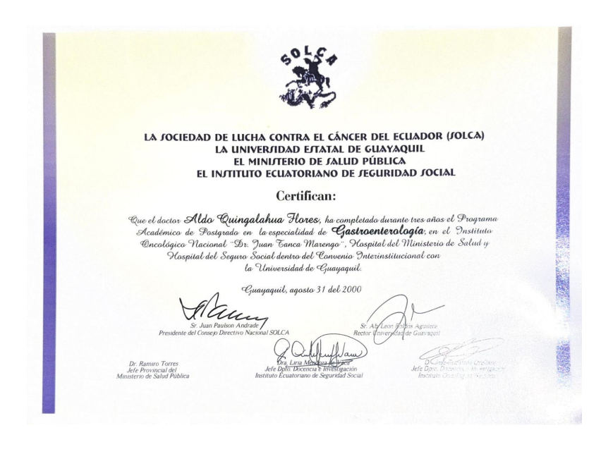 - Título de especialista en Gastroenterología / Instituto Oncológico Nacional - SOLCA / Escuela de Graduados / Facultad de CCMM / Universidad de Guayaquil; 2001