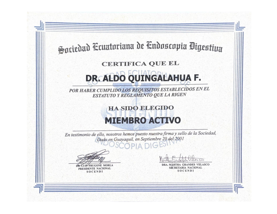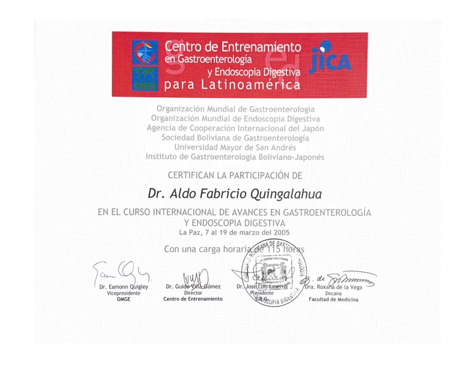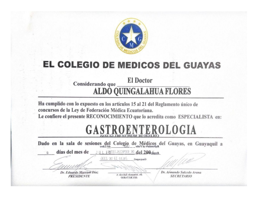 - Reconocimiento como especialista en GASTROENTEROLOGÍA por el Colegio Médico del Guayas – Federación Médica Ecuatoriana, con el # 043/2006