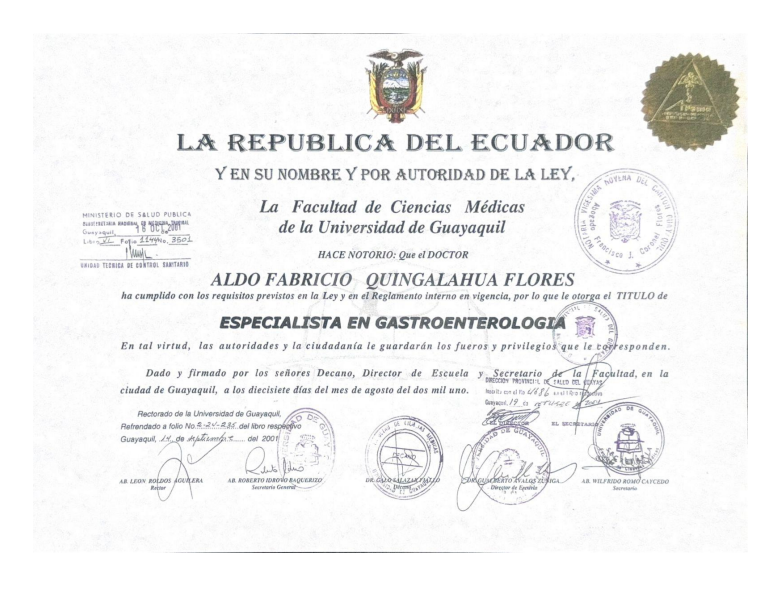 - Registro como especialista en GASTROENTEROLOGÍA en el Ministerio de Salud Pública del Ecuador, con el # 0910255058/2001