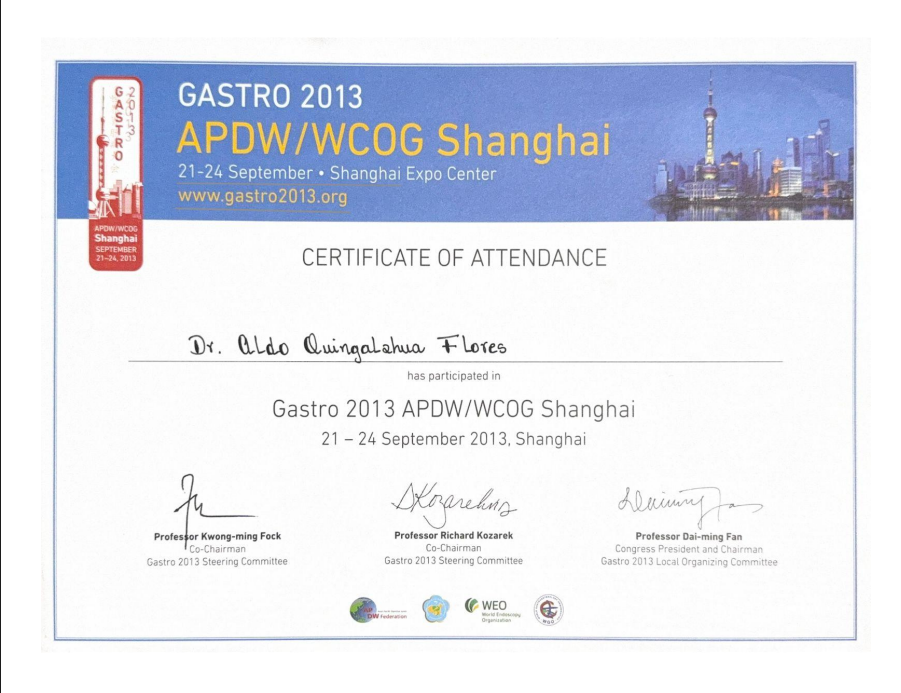 - Congreso Mundial de Gastroenterología APDW/WCOG Shanghai GASTRO 2013. Septiembre /2013