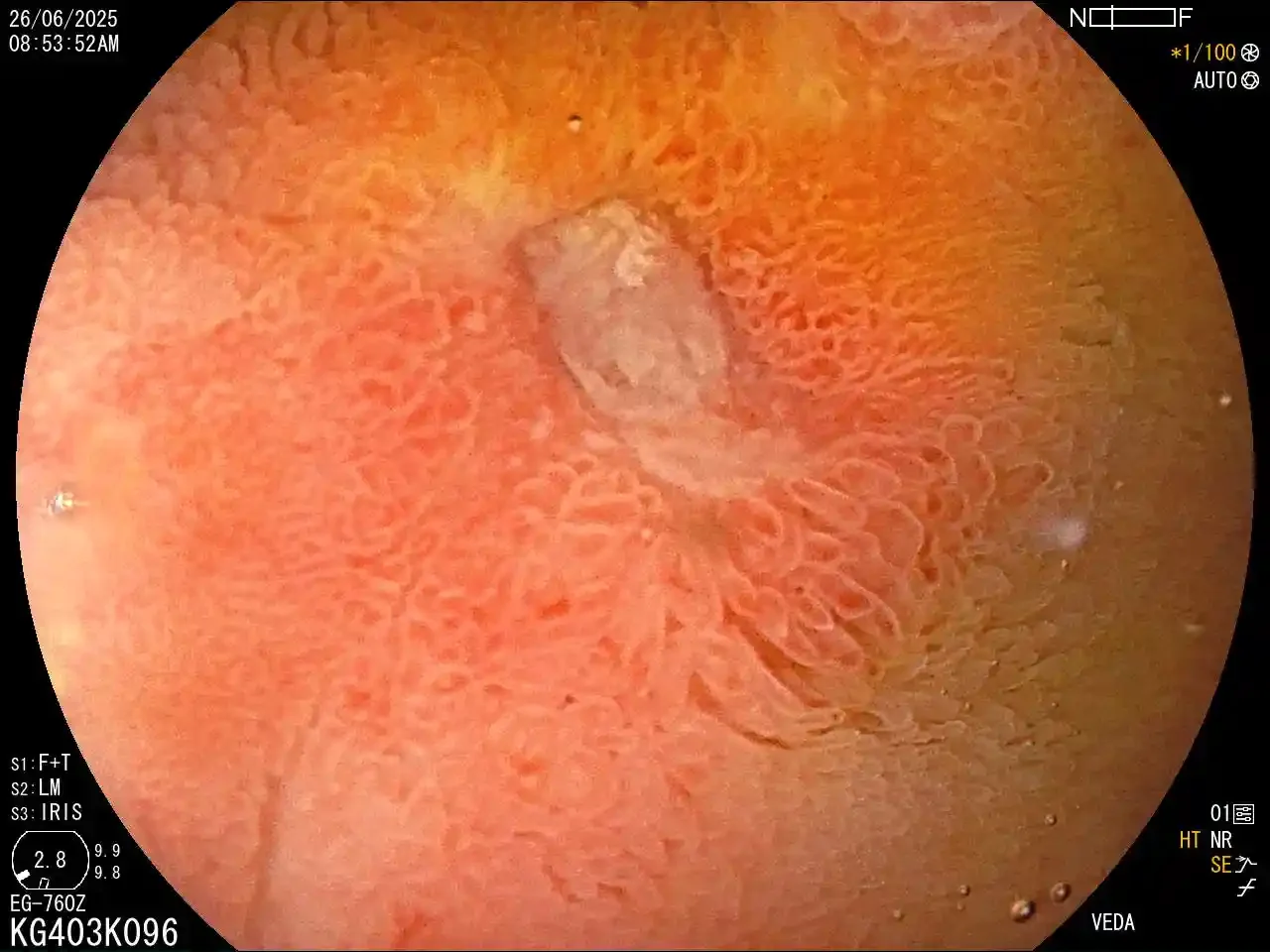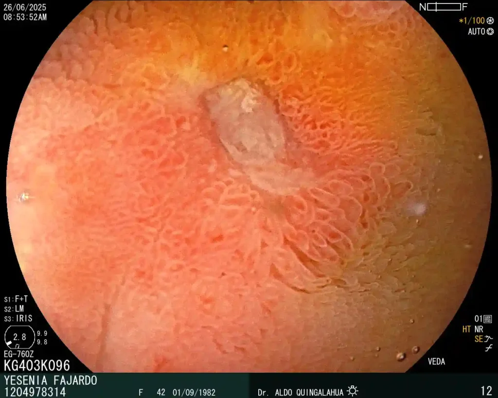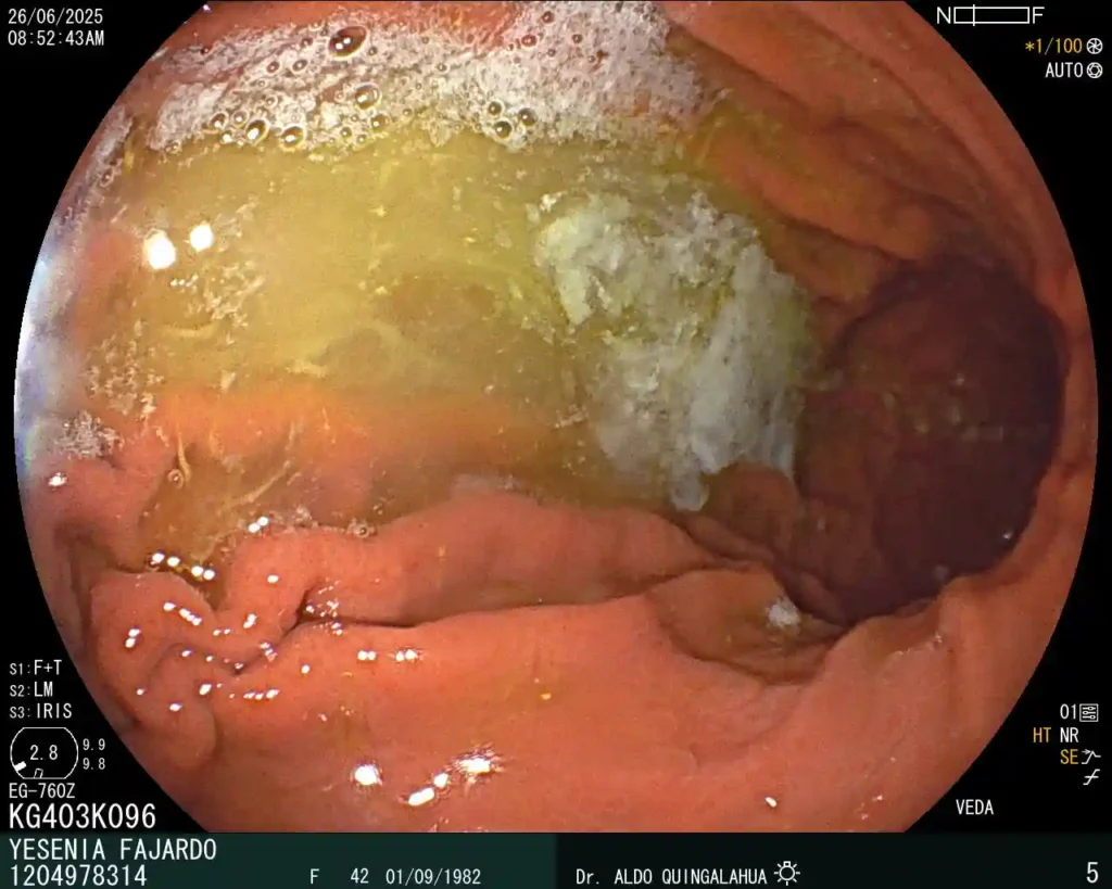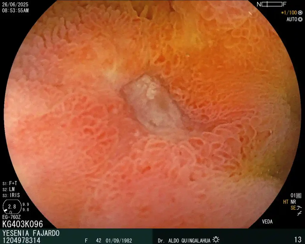 Paciente de 42 años de edad consulta por presentar varios meses dolor en hemiabdomen superior tipo punzada, moderada intensidad, meteorismo, dispepsia, colecistectomía hace un año. No cáncer en la familia. Se realiza video endoscopia digestiva alta observando abundante presencia de bilis en el estómago secundario a reflujo biliar duodeno gástrico; así como en cara anterior de bulbo duodenal una úlcera de forma redondeada de aspecto péptico. Se toma biopsia de la mucosa gástrica reportando Gastritis crónica moderada con Helicobacter pylori; se da tratamiento de erradicación de la bacteria y medicación, así como recomendaciones dietéticas para su reflujo biliar, mejorando la sintomatología.